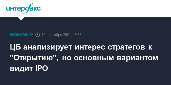 ЦБ в начале августа сообщил о подготовке к продаже акций банка «Открытие» на торгах. Одновременно регулятор заявил, что изучит обращения от потенциальных стратегических инвесторов (прием сообщений заинтересованных лиц пройдет с 11 октября по 22 октября 2021 года). Стратегу могут достаться не менее 50% плюс одна акция, при наличии заинтересованных покупателей торги состоятся до конца 2021 года.