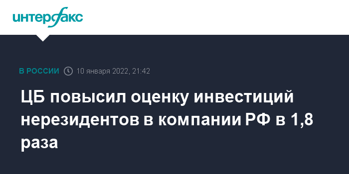 ЦБ пересмотрел в сторону повышения и оценку прямых инвестиций из России в зарубежные компании в январе-сентябре 2021 года — они выросли по сравнению с аналогичным периодом 2020 года более чем в 16 раз, до $38,0 млрд (ранее они оценивались в $26,6 млрд) с $2,3 млрд.