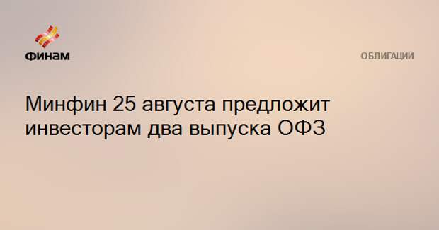 Минфин России планирует 25 августа провести аукционы по размещению облигаций федерального займа с постоянным купонным доходом (ОФЗ-ПД) выпуска № 26237RMFS и облигаций федерального займа с постоянным купонным доходом (ОФЗ-ПД) выпуска № 26240RMFS, говорится в информационном сообщении ведомства. Облигации выпусков размещаются в объеме остатков, доступных для размещения в указанных выпусках.