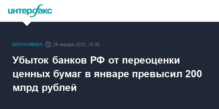 Москва. 28 января. INTERFAX.RU — Убыток российских банков от переоценки ценных бумаг в январе, по предварительным данным, превысил 200 млрд рублей, но системных рисков в этом нет из-за прибыли сектора и запаса капитала, следует из обзора ЦБ РФ «О развитии банковского сектора».