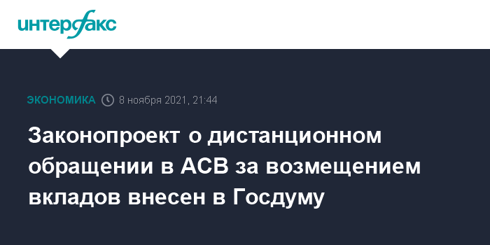9 ноября. FINMARKET.RU — Правительство внесло в Госдуму законопроект о возможности дистанционного обращения в Агeнтство по страхованию вкладов (АСВ) по вопросу возмещения вкладов, документ (N14285-8) размещен в электронной базе данных парламента.