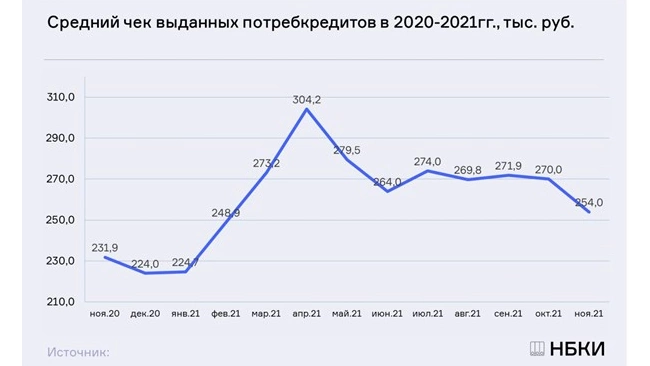 «По данным 4 000 кредиторов, передающих сведения в Национальное бюро кредитных историй, в ноябре 2021 года средний размер выданных потребительских кредитов (кредитов на покупку потребительских товаров) составил 254,0 тысячи рублей, снизившись по сравнению с предыдущим месяцем на 5,9% (в октябре 2021 года – 270,0 тысячи рублей). В то же время по сравнению с аналогичным периодом 2020 года средний чек потребкредита, напротив, вырос — на 9,5% (в ноябре 2020 года – 231,9 тысячи рублей)», — говорится в сообщении.