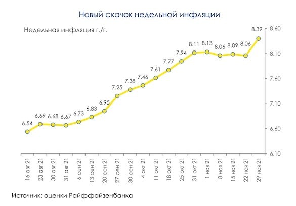 С начала месяца цены прибавили 0,96%, с начала года — 7,51%, а годовая инфляция в 17-й раз в этом году установила рекорд с января 2016 года. Минэконоразвития оценило ее в 8,38% против 8,06-8,13% в предыдущие пять недель.