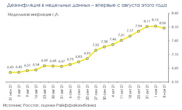 С 2 по 8 ноября темпы роста потребительских цен замедлились вдвое — с 0,21% до 0,09%, а годовая инфляция стала меньше впервые за два месяца — 8,07% против 8,14% неделей ранее.