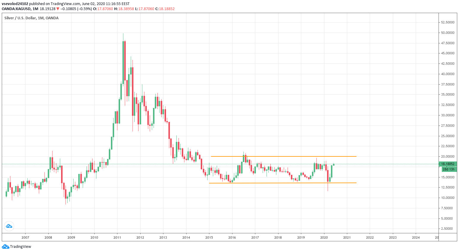 До недавнего времени бенефициаром этой динамики было только золото. Но его рост замедляется (для сравнения: за апрель оно выросло на 6,6%), а популярность уже можно уверенно назвать избыточной. По прогнозам, золото продолжит расти, но это будет уже не такая приятная для инвесторов динамика: дальнейший диапазон оценивается в 1 800–2 000 долларов за унцию при текущей цене в 1 813 долларов. Иными словами, похоже, что золотом инвесторы пресытились и готовы переходить на другой драгметалл. Чем, например, серебро хуже? Может быть, оно готово к росту?