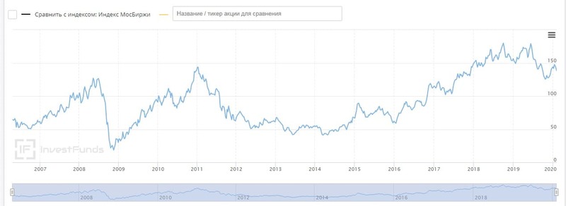 За весь период торгов на бирже минимальная стоимость одной бумаги на графике составляла 16,10 рублей (в период кризиса 2008 года). После резкого падения ценные бумаги показали существенный быстрый рост, и к январю 2011 года цена выросла до 146 рублей. С января 2016 года бумаги показывают динамику роста без существенных колебаний в долгосрочной перспективе. Максимума цена достигала в октябре 2018 и июня 2019 – около 179 рублей.