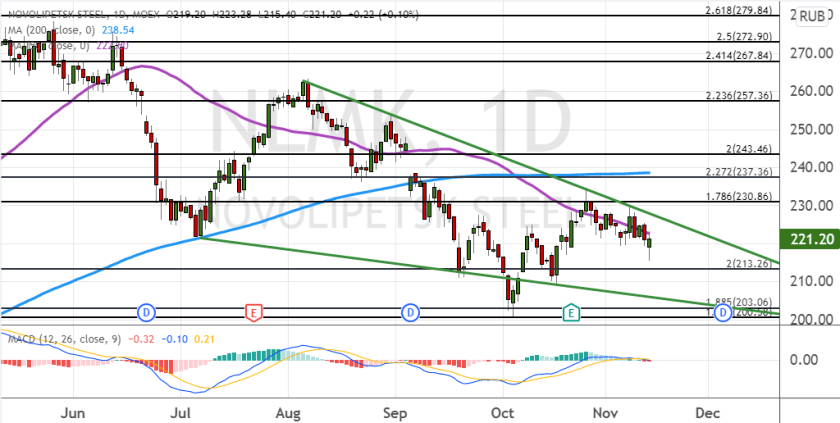 Акции Новолипецкого металлургического комбината (НЛМК) в начале торгов Московской биржи 15 ноября упали на 2,5% — до ₽215,4 по состоянию на 10:00 мск. К 10:48 мск снижение бумаг замедлилось до 0,2%, а цена поднялась до ₽220,68 за акцию.