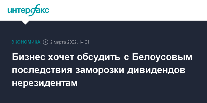 Последствия введенного накануне запрета на выплату российскими эмитентами дивидендов в адрес нерезидентов, как ожидается, будут одной из тем встречи представителей крупного бизнеса с первым вице-премьером Андреем Белоусовым, сообщили «Интерфаксу» два источника, знакомых с ситуацией.