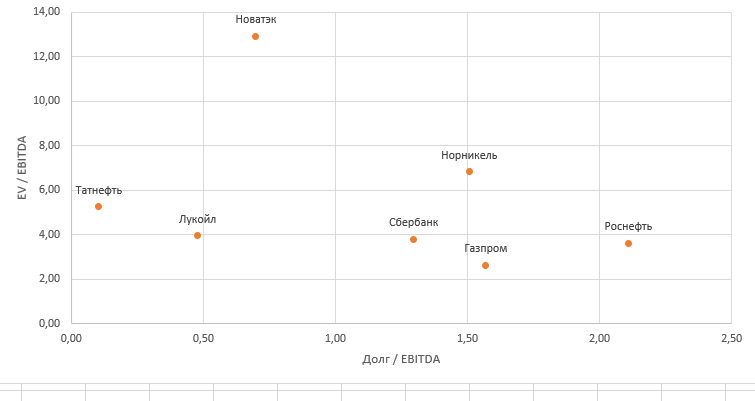 Но сам по себе мультипликатор Долг / EBITDA не столь интересен, так как, глядя на него, нельзя понять, является компания недооцененной или нет. Поэтому инвесторы объединяют мультипликаторы EV / EBITDA и Долг / EBITDA в виде точечной диаграммы, где на оси Х откладывается EV / EBITDA, а по оси Y – Долг / EBITDA.