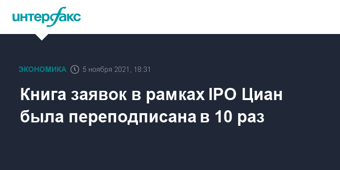 Книга заявок инвесторов в рамках первичного размещения акций (IPO) интернет-агрегатора объявлений рынка недвижимости «Циан» была переподписана более чем в десять раз, рассказал РИА Новости источник в финансовых кругах.