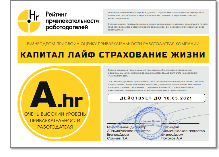 Страховая компания КАПИТАЛ LIFE (ООО «Капитал Лайф Страхование Жизни»), которая обладает самой большой в России агентской сетью на рынке страхования жизни, представленной более 7 тыс. агентов, подтвердила наивысший рейтинг привлекательности работодателя от аналитического центра «БизнесДром» на уровне A.hr. Ранее у компании действовала рейтинговая оценка A.hr от 19.05.2020 г.