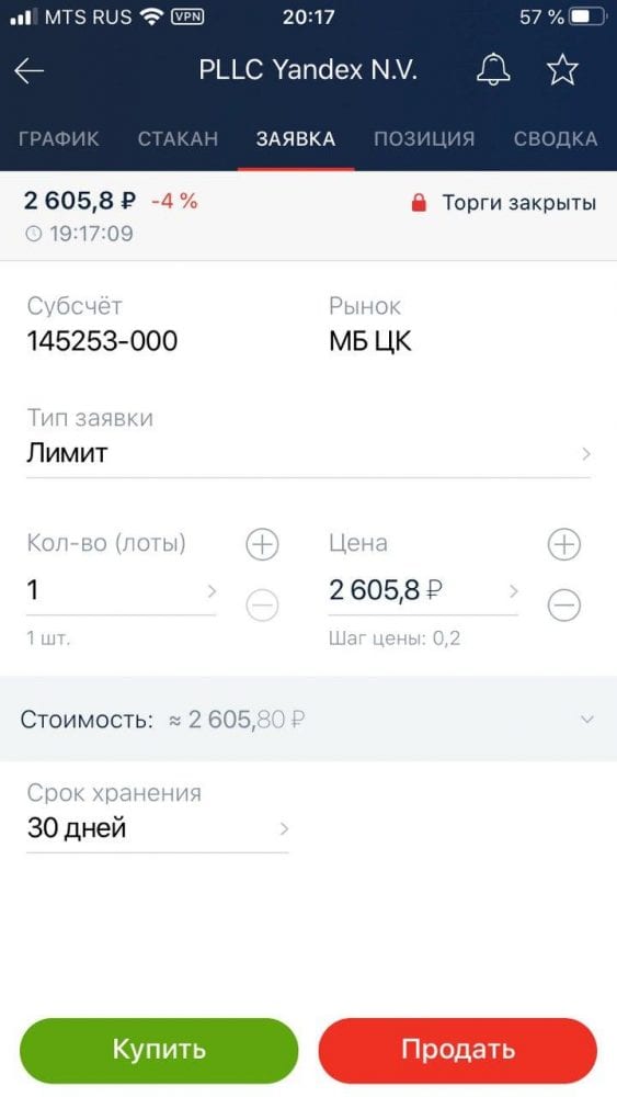 После установки приложения, заходим в раздел Акции РФ и в поиске вводим название компании ( скриншот 1 ). Нажимаем на Yandex NV. Перед нами откроется график Акций Яндекса ( скриншот 2 ). Переходим в раздел «Заявка«. На странице оформления ордера ( заявки ) выбираем нужные нам параметры ( скриншот 3 ). Тип заявки ( ордера ). Количество лотов 1 лот равен 1 акции. Срок хранения, это сколько будет храниться ваша заявка на покупку или продажу акции, например для отложенных ордеров. И нажимаем на кнопку Купить.