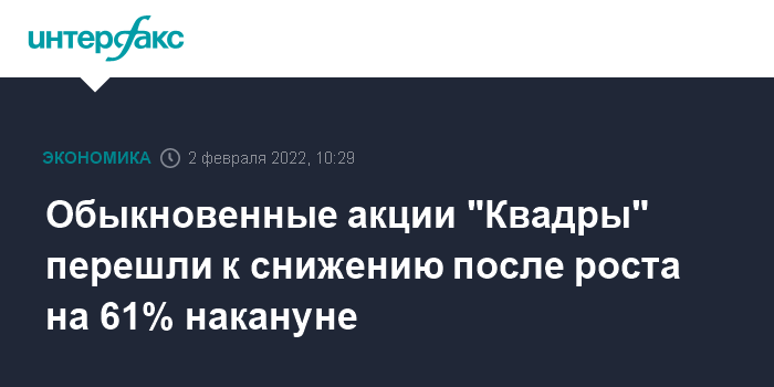 Обыкновенные акции ПАО «Квадра» перешли к снижению в начале торгов на Московской бирже в среду (-4,1%, до 1,2465 копейки за штуку) после роста почти на 61% накануне; при этом привилегированные бумаги продолжают дорожать (+18,3%, до 1,128 копейки за штуку) после роста на 40% во вторник, догоняя тем самым по темпам повышения «обычку», на новостях о продаже пакета 82,47% акций компании структуре «Росатома».