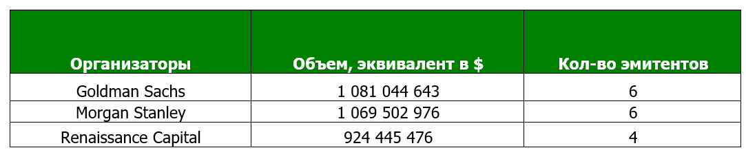 В российский Рэнкинг-2021 попали 25 организаторов. Общий объем привлеченных средств составил 6,605 млрд в долларовом эквиваленте. Это на 13 инвестиционных банков больше, чем по итогам 2020 года. Тогда в рэнкинг попали 12 организаторов с общим объемом привлеченных средств 4,861 млрд в долларовом эквиваленте.