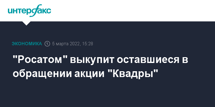 АО «Русатом Инфраструктурные Решения» (РИР, структура ГК «Росатом») выставило обязательное предложение о покупке акций ПАО «Квадра», говорится в раскрытии «Квадры».