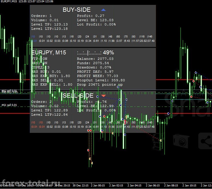 У сформировавшейся сетке ордеров создается общий тейк-профит. После коррекции цены советник закрывает сетку ордеров с прибылью.