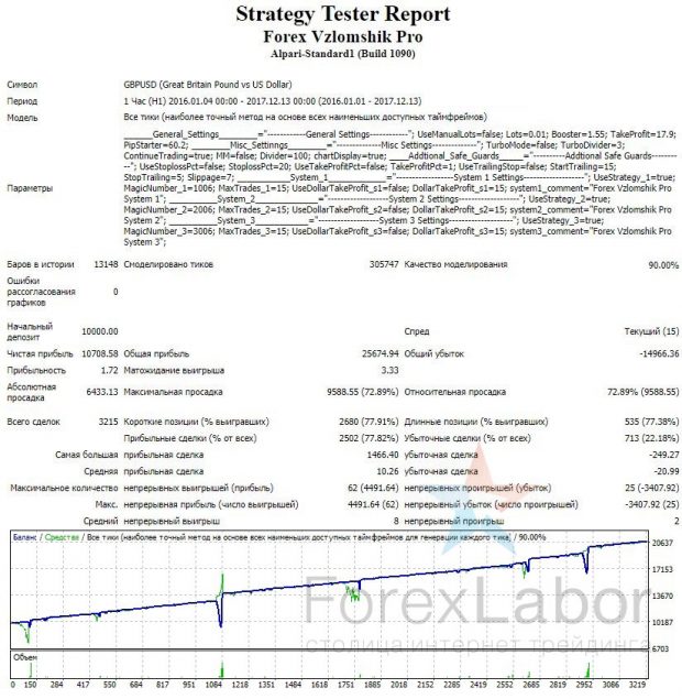 В принципе, мартингейловые советники нет смысла тестировать на длительном временном промежутке по той причине, что все они сливают. Но авторы форекс взломщика подчеркивают его отличную выживаемость, на основании этих доводов тест проводился за период 2016—2017 гг. Рабочий таймфрейм – Н1, настройки стандартные, из тех, что шли в комплекте с роботом под каждую валютную пару.